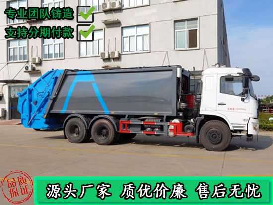 垃圾被车载垃圾推进器又称负压机构推压入车箱,从而使垃圾较高密度、较均匀地分布在车箱内,直至装满为止;该垃圾车的收运方式是目前世界上广泛采用的垃圾收运方式,其专用装置的功能均以汽车发动机为动力,通过液压机构手动或电控来实现。车辆的箱体、装填器又称斗体及污水箱均采用优质炭钢全密封焊接结构,具有强度高、重量轻、不产生二次污染等优点。
